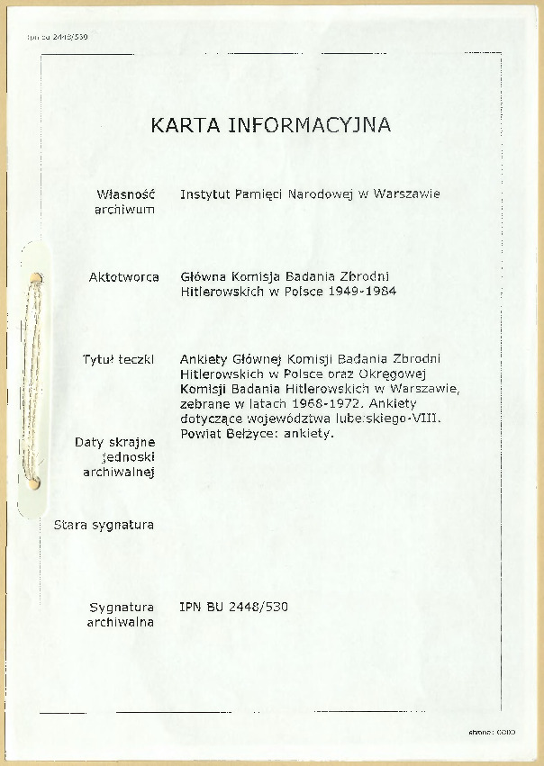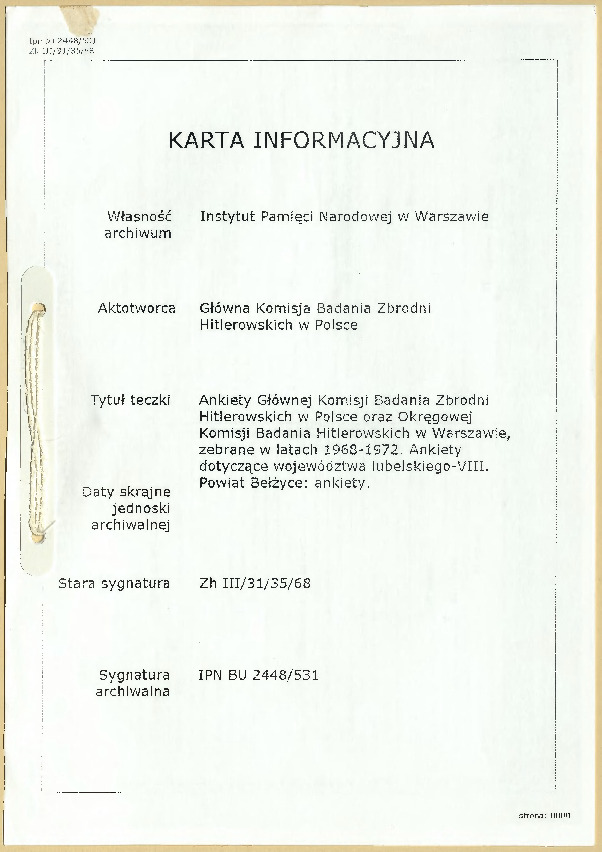 IPN BU 2448/531, Ankiety GKBZHwP oraz OKBZH w Warszawie, zebrane w latach 1968-1972. Ankiety dotyczące województwa lubelskiego-VIII. Powiat Bełżyce: ankiety.