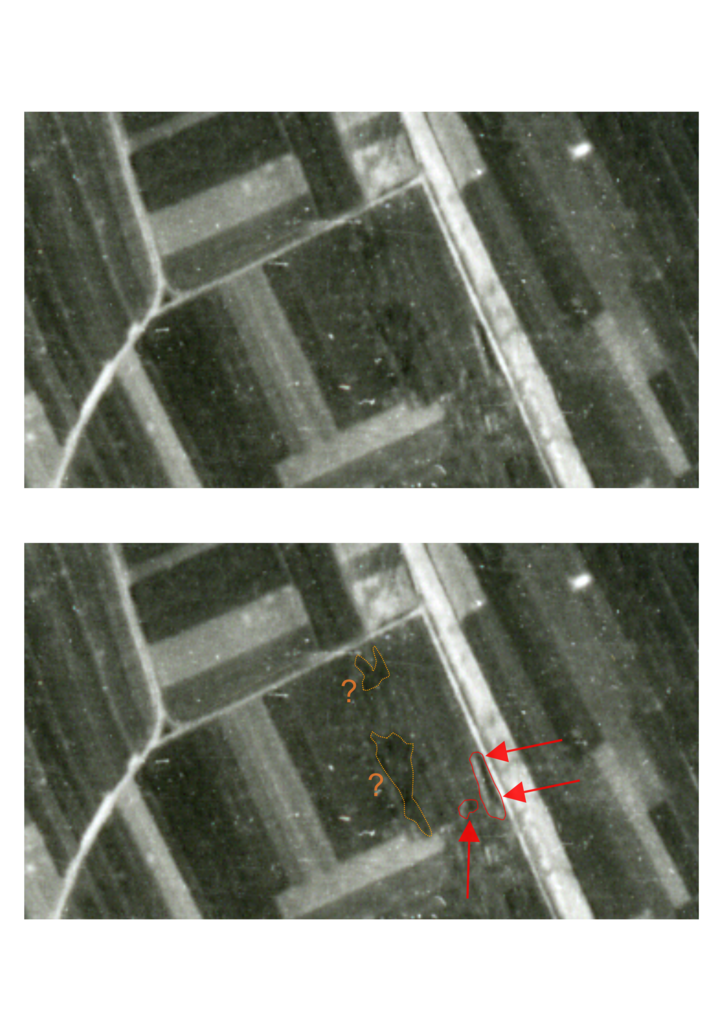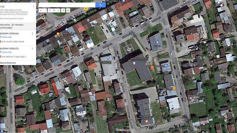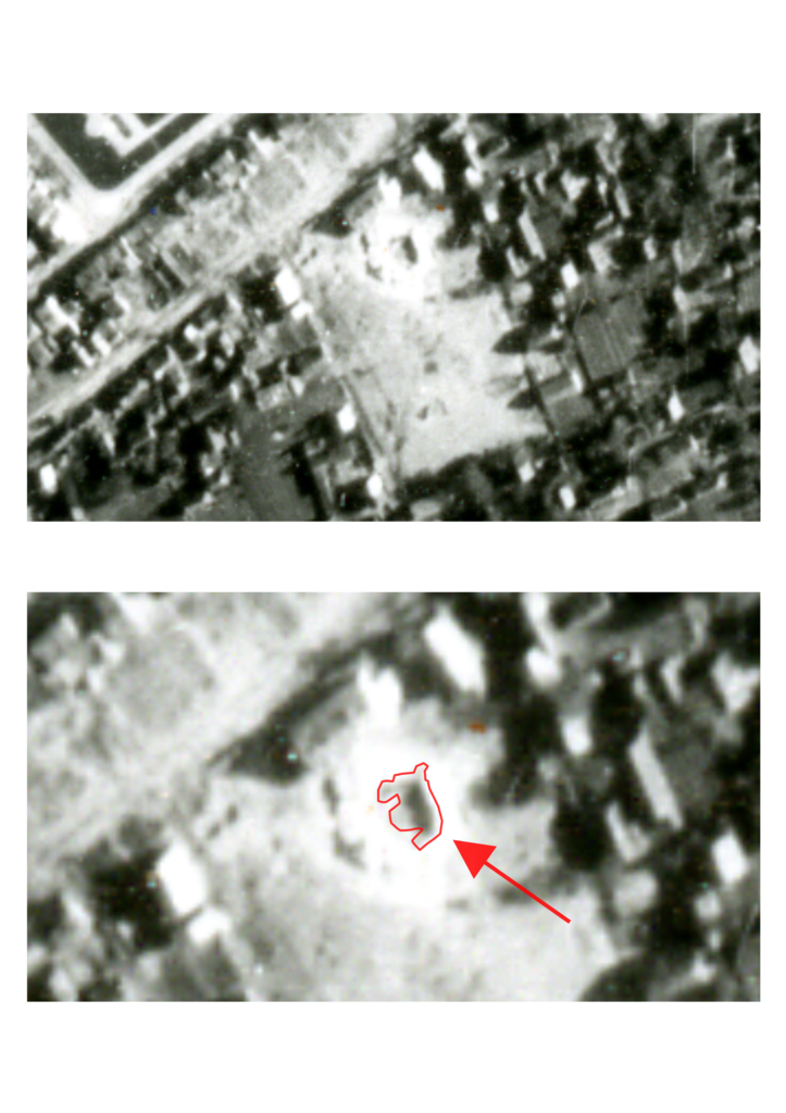 W wyniku przeprowadzonej kwerendy archiwalnych zdjęć lotniczych, pozyskano fotografię o sygnaturze GX67 frame/kadr 109 (data nieznana), którą poddano interpretacji w celu określenia dwóch lokalizacji masowych grobów około 1000 ofiar. Pierwsza lokalizacja poddana interpretacji to obszar przy ul. Tysiąclecia 26, druga lokalizacja to cmentarz żydowski przy ul. Przemysłowej. Obszar przy ul. Tysiąclecia wyraźnie ukazuje budynek (Synagoga) stojący tuż przy krawędzi dzisiejszej ulicy Tysiąclecia. Za budynkiem w kierunku południowym widoczne jest wyraźne naruszenie gruntu, w postaci dużego zagłębienia w ziemi. Dół ten z dużym prawdopodobieństwem jest masowym grobem zamordowanych ofiar w maju 1943 r. i opisywanym przez świadka. Druga lokalizacja poddana interpretacji to cmentarz żydowski przy ul. Przemysłowej, opisywany jako miejsce zbiorowych pochówków ofiar. W przypadku cmentarza wskazywana lokalizacja jednego z grobów to południowo-wschodni narożnik cmentarza. Na fotografii lotniczej bardzo wyraźnie widoczne podłużne naruszenie gleby, (biegnące w osi północ-południe) w południowo-wschodnim narożniku cmentarza (zaznaczono czerwonymi strzałkami). Ponadto na archiwalnym zdjęciu widoczne są liczne naruszenia gleby w północnej, centralnej oraz południowej części cmentarza (zaznaczono kolorem pomarańczowym).