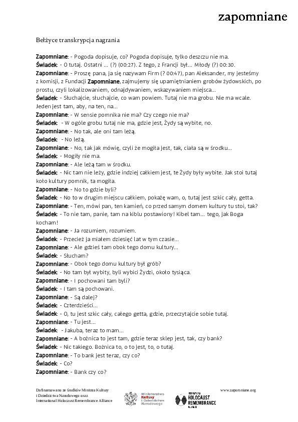 Nagranie Fundacji Zapomniane (zapis audio), mieszkaniec Bełżyce ur. 1935 r., temat i słowa klucze: żydowskie groby w Bełżycach, Zagłada Żydów w Bełżycach, Bełżyce, 14 czerwca 2019 r.