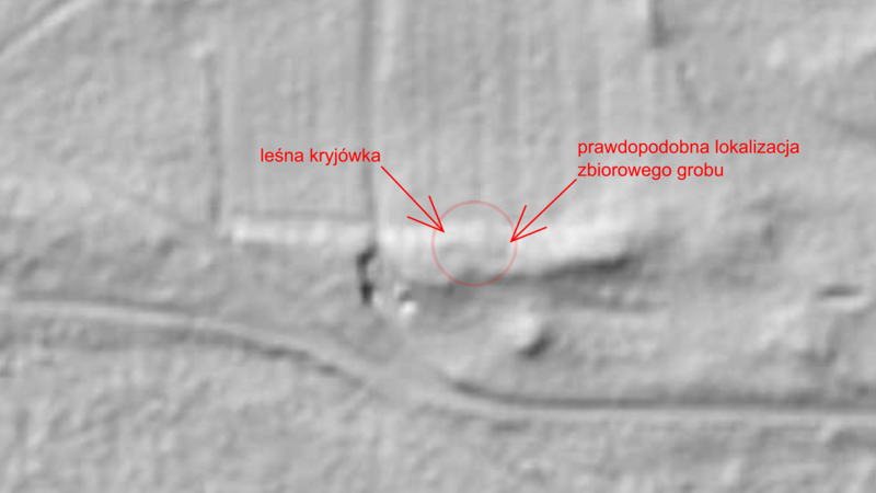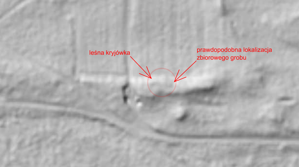 Pomiar rzeźby terenu wyraźnie ukazuje skarpę, w której oba miejsca są zlokalizowane. Ze względu na niską rozdzielczość pomiaru rzeźby terenu (LIDAR) depresja odpowiadająca za przybliżone miejsce zbiorowego grobu jest słabiej widoczna.