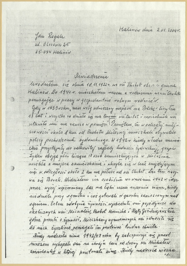 „Pamiętam, że w odległej miejscowości, około 8 km od Chobotu, mieszkali obywatele polscy pochodzenia żydowskiego. W 1942 r., kiedy władze niemieckie przystąpiły do całkowitej zagłady ludności żydowskiej, grupa Żydów obojga płci licząca 13 osób, zamieszkująca w Miłośnie, uciekła z miejsca zamieszkania i ukryła się w lesie znajdującym się około 2 km na północ od wsi Chobot. Las ten nazywał się Borek. Widziałem ich osobiście we wrześniu 1942 r., idąc przez wyżej wspomniany las na łąki celem suszenia siana, kiedy siedzieli przy ognisku i coś gotowali w garnku zawieszonym nad ogniem. Celem zdobycia żywności wychodzili pojedynczo do okolicznych wsi Michałów, Chobot, Mrowiska i Kąty Goździejewskie, gdzie prosili o żywność. Mieszkańcy okolicznych wsi odnosili się do nich życzliwie, pomagali im przetrwać trudne chwile. Kiedy nadeszła zima 1942/1943 roku, by zabezpieczyć się przed mrozem, wykopali oni na skraju lasu od strony wsi Michałów ziemiankę, w której przetrwali zimę. Kiedy nadeszła wiosna zdarzyło się, że po skraju lasu szli Niemcy po polowaniu. Być może przypadkowo odkryli ziemiankę, a w niej znajdujących się Żydów, nic jednak nie uczynili. Dopiero po kilku dniach przyjechali niemieccy żandarmi i wywlekli z ziemianki 12 Żydów. Kazali ułożyć się rzędem przy ziemiance i strzałem z broni palnej wszystkich zabili. Ocalała jedynie licząca około 20. lat Żydówka, która w tym czasie poszła po żywność do jednej z pobliskich wsi. Ta Żydówka nazywała się Ostrzega, ukrywała się u życzliwych ludzi do końca wojny. Zabitych Żydów Niemcy rozkazali pogrzebać sołtysowi wsi Borek tuż obok ziemianki w miejscu, gdzie zostali zabici. Obecnie na tym miejscu rośnie las.” (oświadczenie Jana Rogali ur. 1922 r, z 2 stycznia 2004 r.)