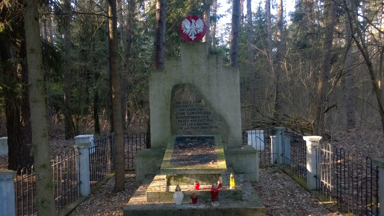 „Zboże już było duże i było ciepło. Pewnego dnia po południu, przyjechali samochodem ciężarowym Niemcy do sołtysa i kazali mu natychmiast zebrać 40 mężczyzn z łopatami, wśród których i ja się znalazłem. […] Zaprowadzili nas na polanę przy wschodnim skraju lasu. […] Tam kazali nam wykopać trzy doły o wymiarach 4 x 4 x 4 m. Środek dna każdego z tych dołów o powierzchni 1 m² trzeba było jeszcze pogłębić na 1 m. […] Każdy z tych dołów, jak niektórzy obliczali, mógł pomieścić około 900 osób.” (Sędziak, 1987) Obecnie w tym miejscu znajduje się kwatera i pomnik z 1963 r.