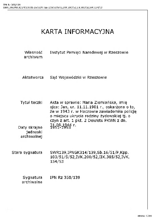 IPN Rz 358/139 Akta w sprawie: Maria Ziemiańska, imię ojca: Jan, ur. 11.11.1901 r., oskarżona o to że w 1943 r. w Haczowie zawiadomiła policję o miejscu ukrycia rodziny żydowskiej tj. o czyn z art. 1.pkt 2 Dekretu PKWN z dn. 31.08.1944 r.