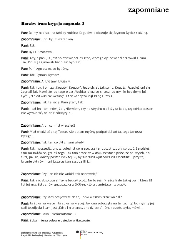 Nagranie Fundacji Zapomniane [zapis audio], imię: Roman i Krystyna W., mieszkańcy gminy Haczów, temat i słowa klucze: Tauba, żydowski grób przy cmentarzu parafialnym, rozm. przepr. Anna Skiba i Agnieszka Nieradko, Haczów, 16 maja 2022 r.