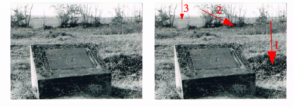 Na fotografii nagrobka Chaji Brenner (data nieznana), tuż za nagrobkiem wyraźnie widoczne naruszenia gleby w postaci zapadliska, a także małej hałdy ziemi prawdopodobnie pochodzącej z miejsca wkopu jamy grobowej (zał. nr. 3 – strzałka 1). W tle wyraźnie widoczna zachodnia granica cmentarza (zał. nr. 3 – strzałka 2). Na ostatnim planie widoczne jest pole orne oraz prawdopodobnie droga polna (zał. nr. 3 – strzałka 3).