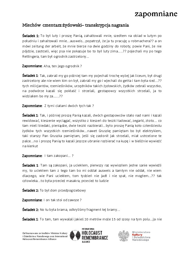 Materiały dotyczące żydowskich grobów wojennych w Miechowie (transkrypcje zeznań świadków, pliki video i audio z relacjami świadków) zostały opracowane dzięki dofinansowaniu ze środków Stowarzyszenia Żydowski Instytut Historyczny w ramach projektu “Żydowskie groby wojenne. Dokumentacja.”