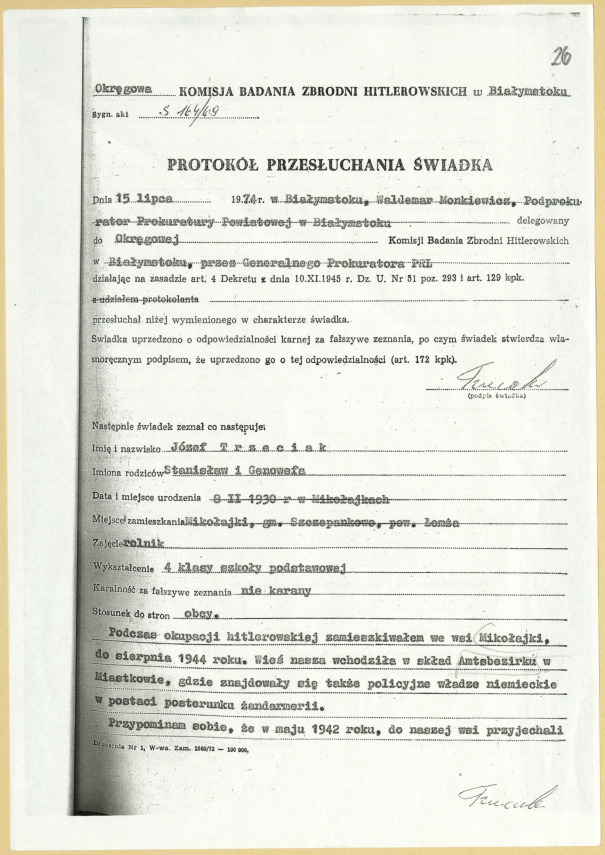 “O ile sobie przypominam, w maju 1942 roku do naszej wsi przyjechali żandarmi z Miastkowa i funkcjonariusze gestapo z Łomży. Najpierw zabrali Stanisława Gudelskiego, który mieszkał na kolonii oraz po przybyciu do wsi [Mikołajki] Antoniego Kenigsmana. U tego ostatniego przeprowadzili rewizję w zabudowaniach i znaleźli dwóch Żydów i Żydówkę, którzy ukrywali się przed Niemcami. […] Jeden z Żydów został od razu zastrzelony na miejscu. Słyszałem strzały, a następnie, gdy zbliżyłem się tam, zobaczyłem zwłoki zamordowanego leżące na podwórku zabudowań Kenigsmana. Był to mężczyzna w wieku około 60 lat nazwiskiem Całka, kupiec. Pochodził z Łomży. […] Zwłoki zamordowanego na polecenie żandarmów i w ich obecności zakopano za wsią w odległości około 100 metrów od zabudowań na polu serwitutowym. Nadmieniam, że drugiego Żyda i Żydówkę żandarmi zastrzelili na miejscu, gdzie pochowali zwłoki pierwszego i razem zakopali.”