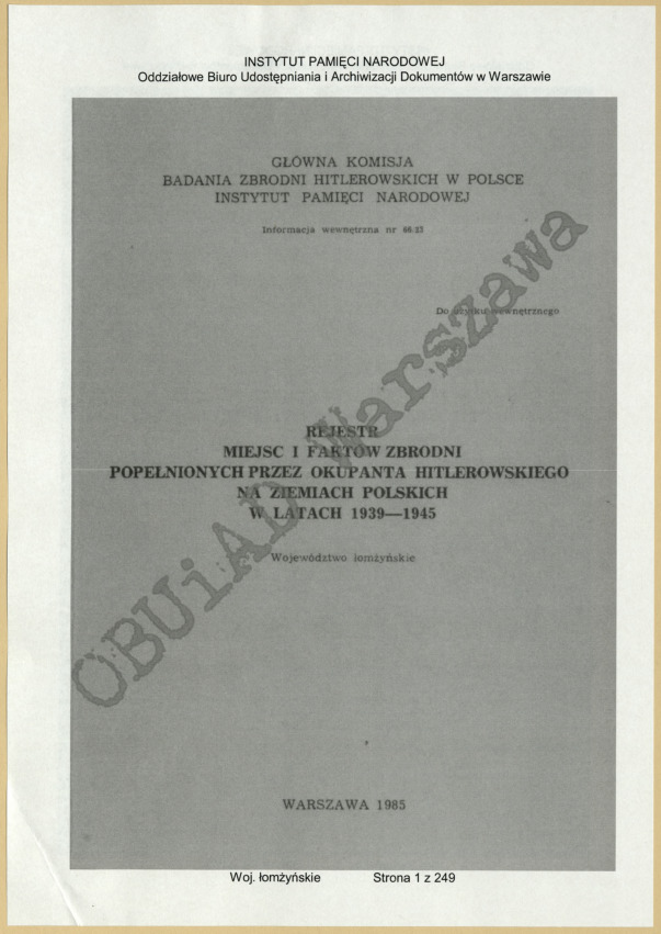 Rejestr miejsc i faktów zbrodni popełnionych przez okupanta hitlerowskiego na Ziemiach Polskich w latach 1939-1945, woj. łomżyńskie, Warszawa 1985. s 142-143.