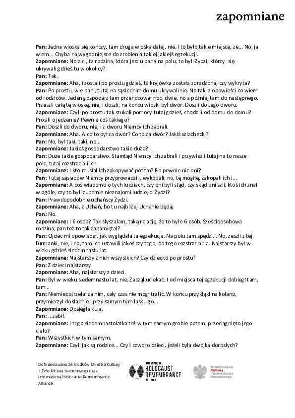 “Jedna wioska się kończy, tam druga wioska dalej. I to było takie miejsce, że… No, ja wiem… Chyba najwygodniejsze do zrobienia takiej egzekucji… Po prostu, wie pani, tutaj na sąsiednim domu ukrywali się. No tak, z opowieści co wiem od rodziców. Jeden gospodarz tam przenocował noc, dwie, no a później tam do następnego. Przeszli całą tę wioskę i na końcu wioski był dwór. Doszli do tego dworu. Duże takie gospodarstwo. Stamtąd Niemcy ich zabrali i przywieźli tutaj na to nasze pole, tutaj rozstrzelali ich. Tutaj sąsiadów Niemcy przyprowadzili, wykopali, no, tę mogiłę, zakopali ich. To byli prawdopodobnie uchańscy Żydzi. Ojciec mi opowiadał, jak wyglądała ta egzekucja. No, zeszli z tej furmanki, nie, tam ich ustawili jakoś czy tego, do tego rozstrzelania. Najstarszy był w wieku gdzieś siedemnastu lat. Zaczął uciekać. I od miejsca tej egzekucji dobiegł tam, tam… Niemiec strzelał za nim, cały czas nie mógł trafić. W końcu przykląkł na kolano, przymierzył dokładnie i przy samym tym lasku go zabił.