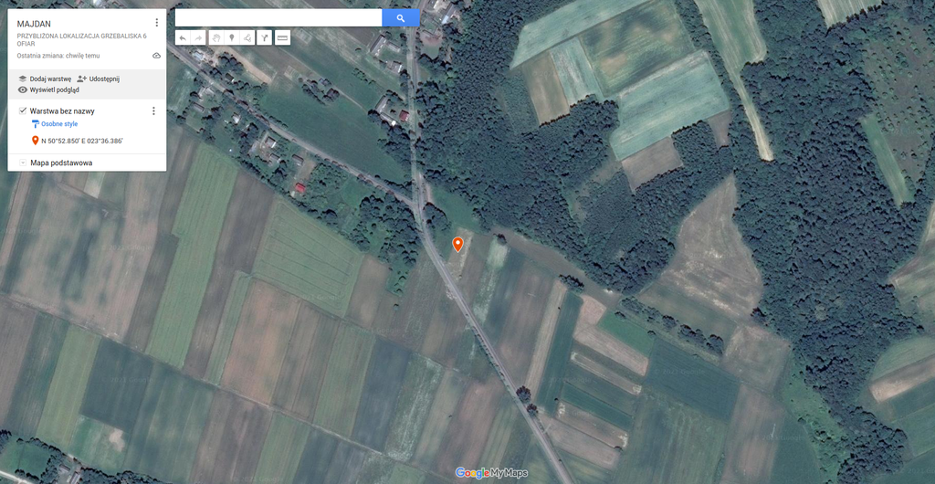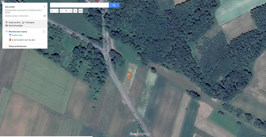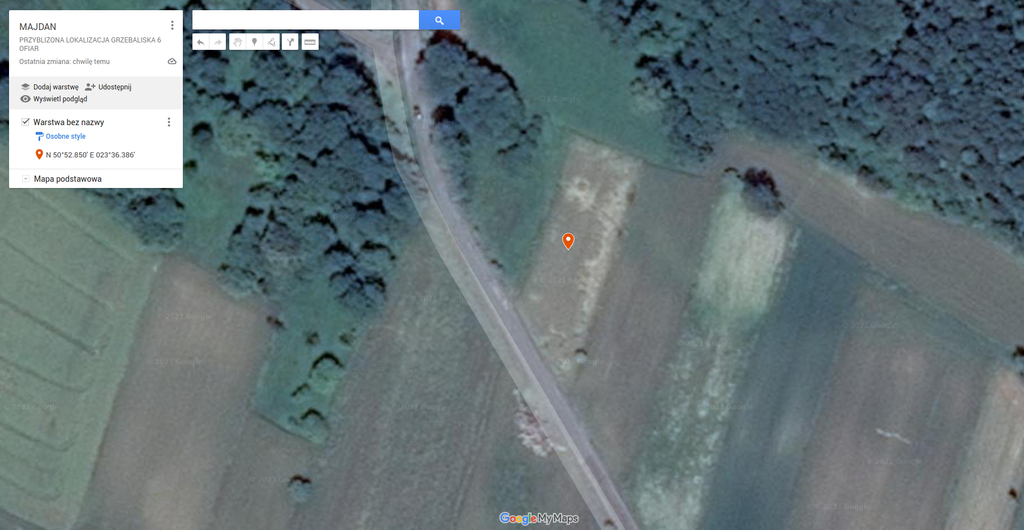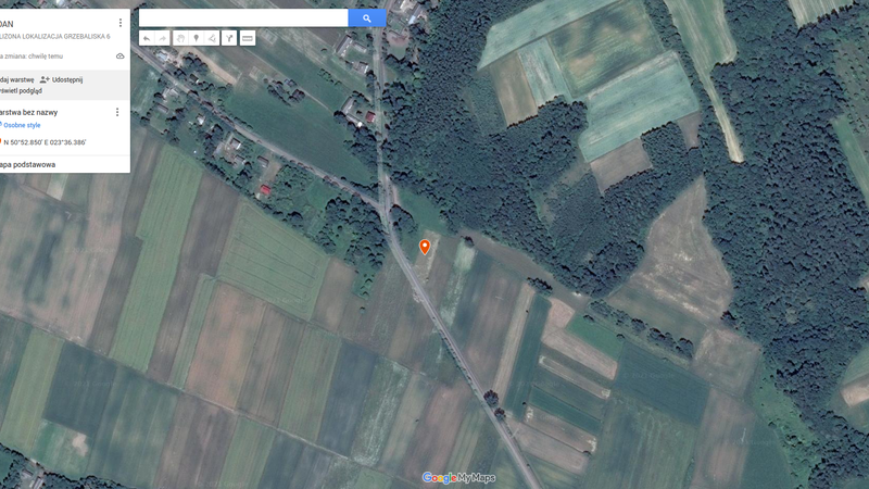 W dniu 31.05.2021 r. przeprowadzono wizję lokalną w obecności świadka (II pokolenie), który zakreślił obszar w którym zlokalizowany jest zbiorowy grób 6 ofiar (przybliżone koordynaty GPS: N 50°52.850′ E 023°36.386′).