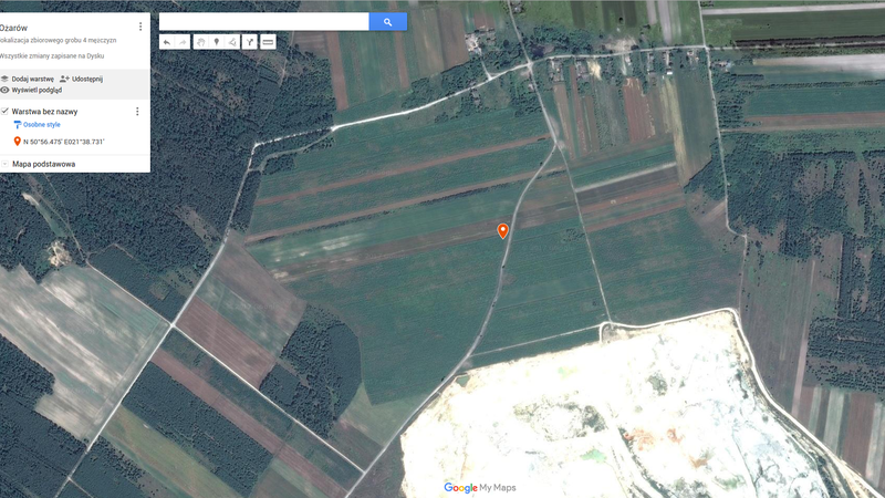 Syn pana Antoniego, wskazał nam miejsce, w którym według jego ojca mają być zakopane ciała czterech żydowskich mężczyzn. Tak opisuje grób: “Do półtorej metra dół był i tam była glina w głębi. Z półtorej metra szerokości. One były [ułożeni] głową do drogi. Trochę zachodziło jeden na drugiego, bo się nie mieściły. Były takie chłopaki zbudowane.” (Ćmielów, 6 czerwca 2015 r.)