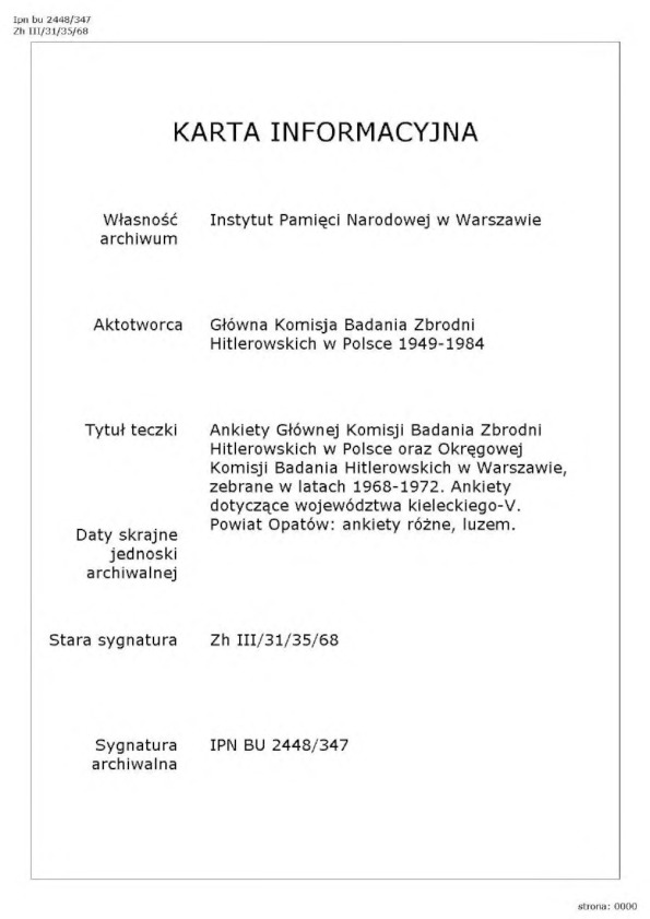 IPN BU 2448/347, Ankiety Głównej Komisji Badania Zbrodni Hitlerowskich w Polsce oraz Okręgowej Komisji Badania Zbrodni Hitlerowskich w Warszawie zebrane w latach 1967-1972. Ankiety dotyczące woj. kieleckiego, tom V, pow. Opatów: Ankiety, różne [luzem].