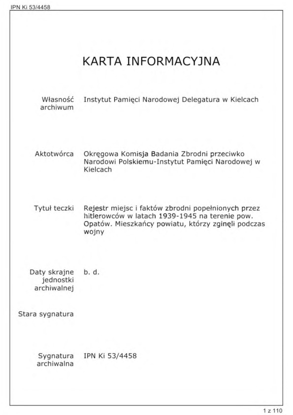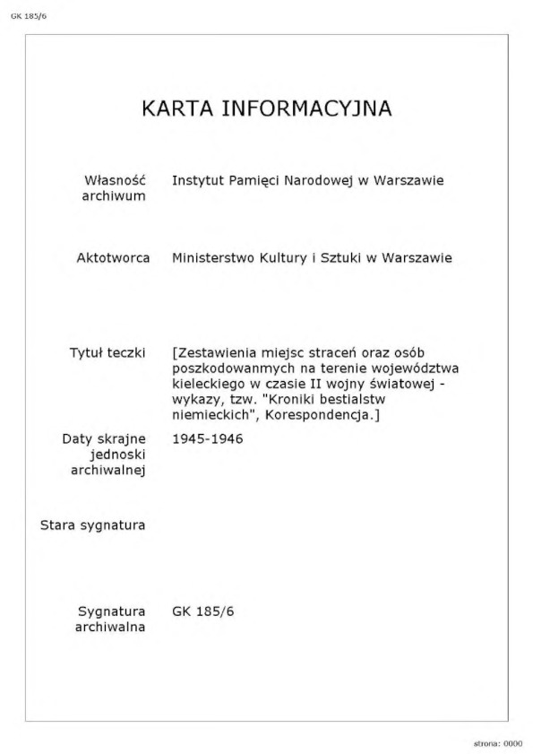IPN GK 185/6, Zestawienie miejsc straceń oraz osób poszkodowanych na terenie woj. kieleckiego w czasie II wojny światowej: wykazy tzw. “kronik bestialstw niemieckich”, korespondencja.