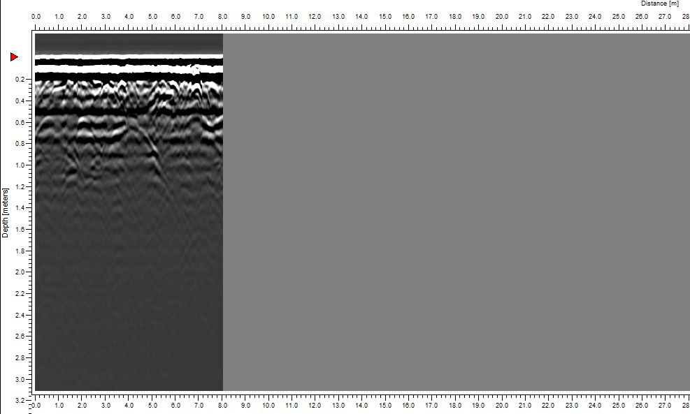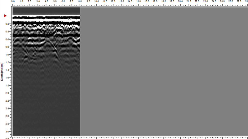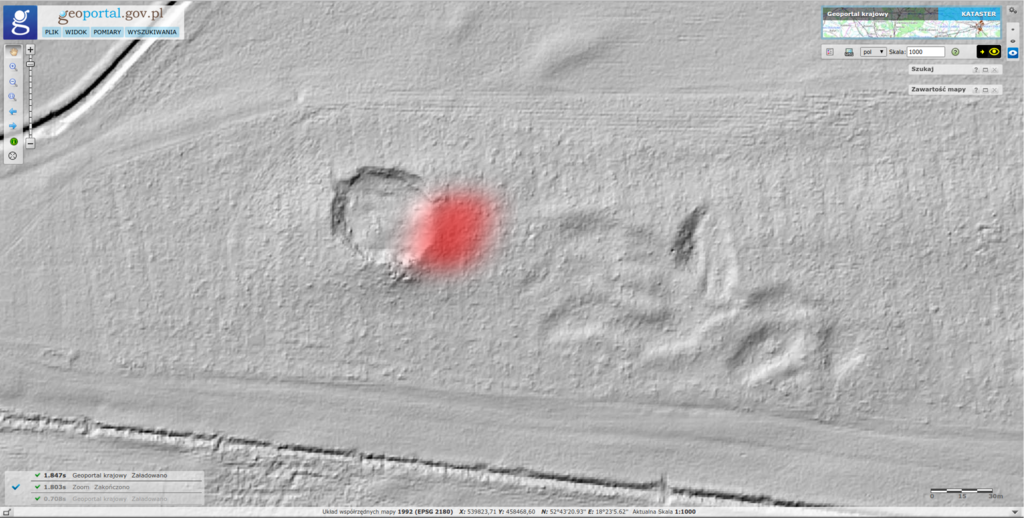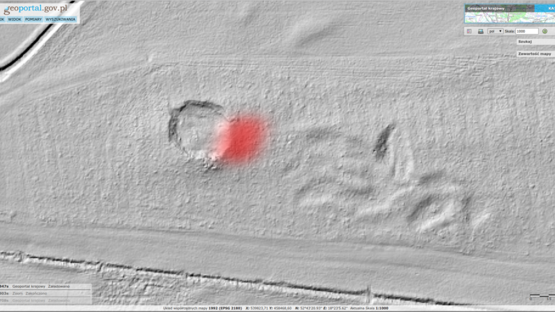 Pomiar rzeźby terenu (LIDAR) wyraźnie ukazuje bardzo rozległy przekop, który jest zlokalizowany obok miejsca, gdzie przeprowadzono badania georadarowe.