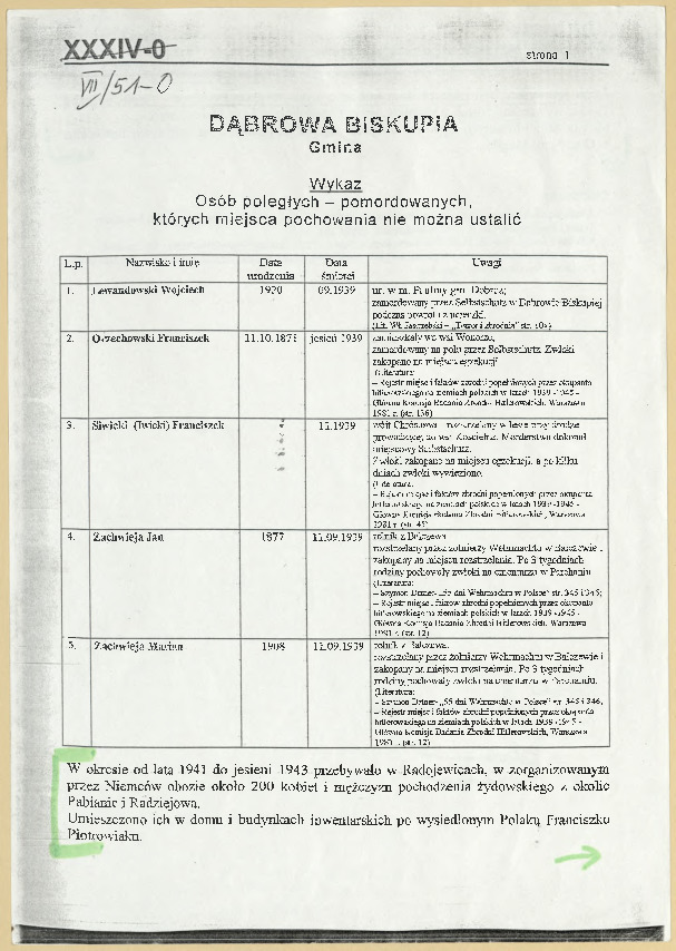 Dmochowski W., Wykaz osób poległych–pomordowanych, których miejsca pochowania nie można ustalić. Gmina Dąbrowa Biskupia, s. 1- 2, Wojewódzki Obywatelski Komitet Ochrony Pomników Walki i Męczeństwa w Bydgoszczy.