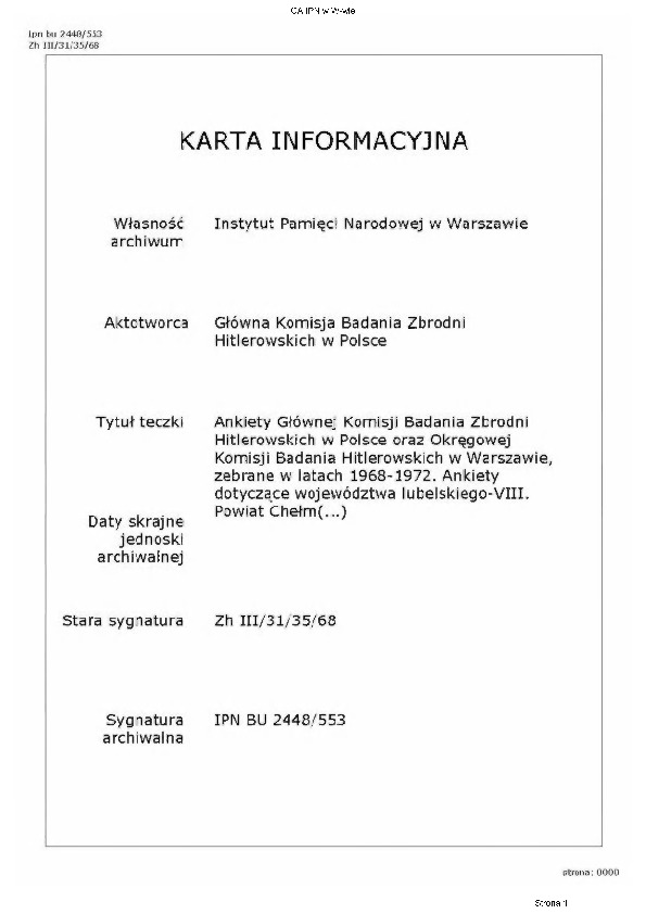 IPN BU 2448/553, Ankiety Głównej Komisji Badania Zbrodni Hitlerowskich w Polsce oraz Okręgowej Komisji Badania Zbrodni Hitlerowskich w Warszawie, zebrane w latach 1968-1972. Ankiety dotyczące województwa lubelskiego, powiat Chełm