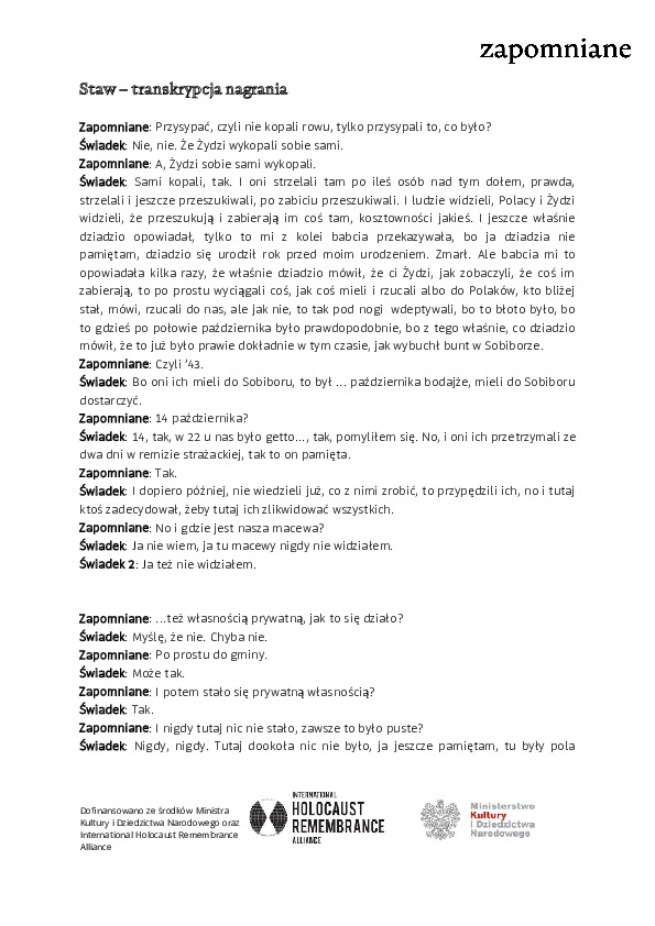 Nadal poszukujemy informacji nt. tożsamości żydowskich ofiar w miejscowości Staw. Jeżeli wiesz coś więcej, napisz do nas na adres mailowy: fundacjazapomniane@gmail.com.