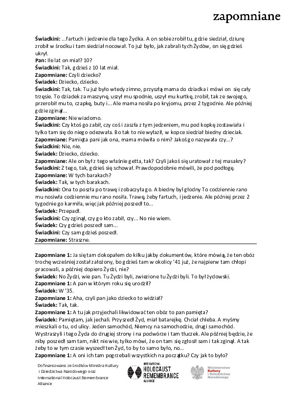 “Tak, były dwa rowy długie, a jeden krótszy o połowę był. To w tych dwóch to Żydzi te, a w tym krótkim była policja żydowska. Tam żydowska policja pilnowała. Tam, ci co blisko mieszkali, to ze strychu okienkiem podglądali to mówili, że ta policja żydowska, jak ktoś nie chciał iść to wypychała. Oni musieli pewno myśleć, że oni przeżyją. Oni wybili tych, zasypali i później tych Żydów [żydowskich strażników] pozabijali. […] Były kobiety, dzieci, wszystko było”. (sierpień, 2022 r.)