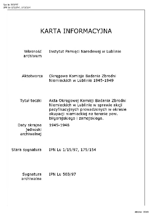 IPN Lu 503/97 Akta Okręgowej Komisji Badania Zbrodni Niemieckich w Lublinie w sprawie akcji pacyfikacyjnych prowadzonych w okresie okupacji niemieckiej na terenie pow. biłgorajskiego i zamojskiego s. 1, 65-73