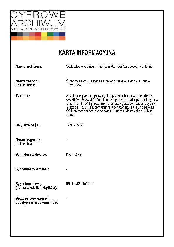 IPN Lu 431/109 t.1 Akta karnej pomocy prawnej dot. przesłuchania w charakterze świadków: Edward Steindl i inni w sprawie zbrodni popełnionych w latach 1941-1943 przez funkcjonariuszy gestapo rezydujących w m. Izbica – SS-Hauptscharfuhrera o nazwisku: Kurt Engels oraz SS-Unterscharfuhrera o nazwisku: Ludwik Klemm alias Ludwig Jantz s. 1, 36-40, 57-70