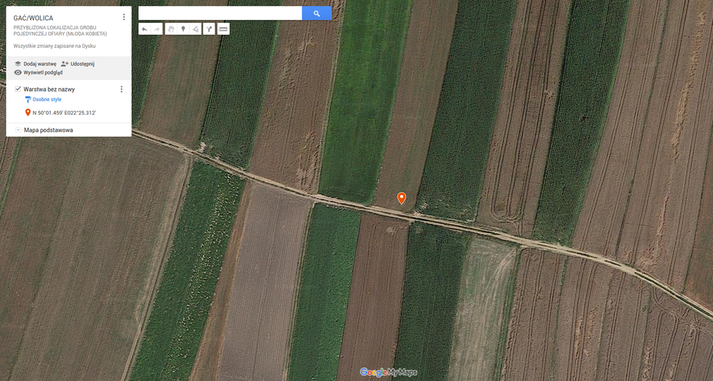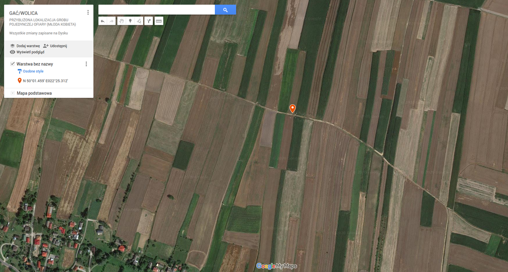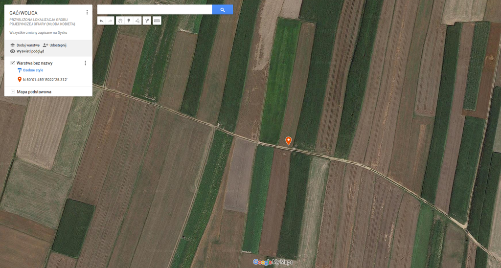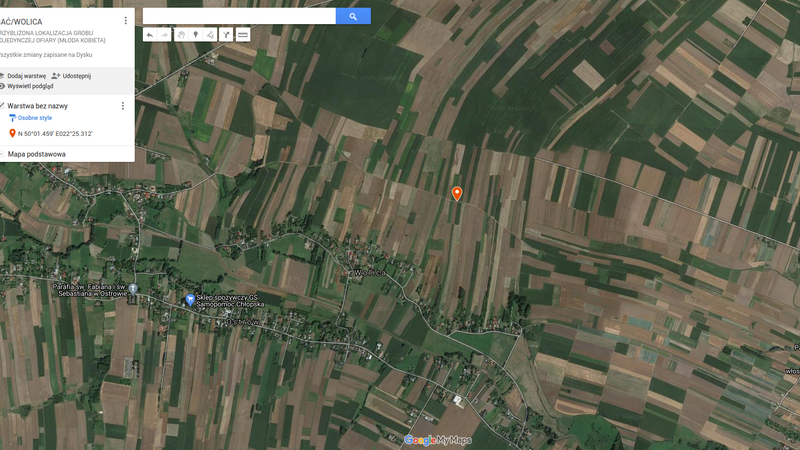 Na polu uprawnym należącym do prywatnego właściciela znajduje się pojedynczy grób młodej kobiety. Oto okoliczności natrafienia na jej szczątki przez okolicznych mieszkańców oraz zakopania ciała, zebrane przez osobę, która zgłosiła Fundacji istnienie tego grobu.